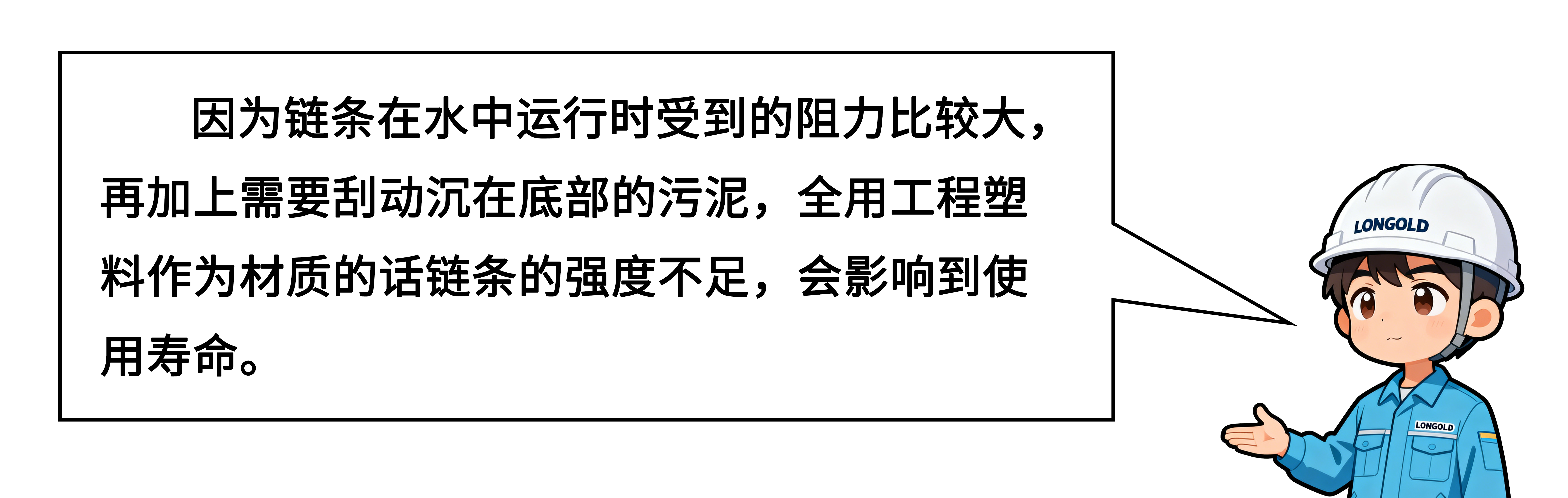 當(dāng)鏈條帶動(dòng)刮泥擋板經(jīng)過(guò)水面上方時(shí),便可以將污水表面的油脂油污刮走,而當(dāng)鏈條轉(zhuǎn)到水面之下時(shí),又可以刮動(dòng)池底沉積下來(lái)的淤泥以及微生物到指定的位置,從而完成對(duì)水體的進(jìn)一步凈化。